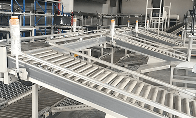 输送机主要是完成物料的输送任务。在环绕库房、生产车间和包装车间的场地,设置有由许多皮带输送机、滚筒输送机等组成的一条条输送链,经首尾连接形成连续的输送线。在物料的入口处和出口处设有和路径叉口装置、升降机和地面输送线。在仓库、生产车间和包装车间范围内形成既可顺畅到达各个生产位置同时又是封闭的循环输送线系统。